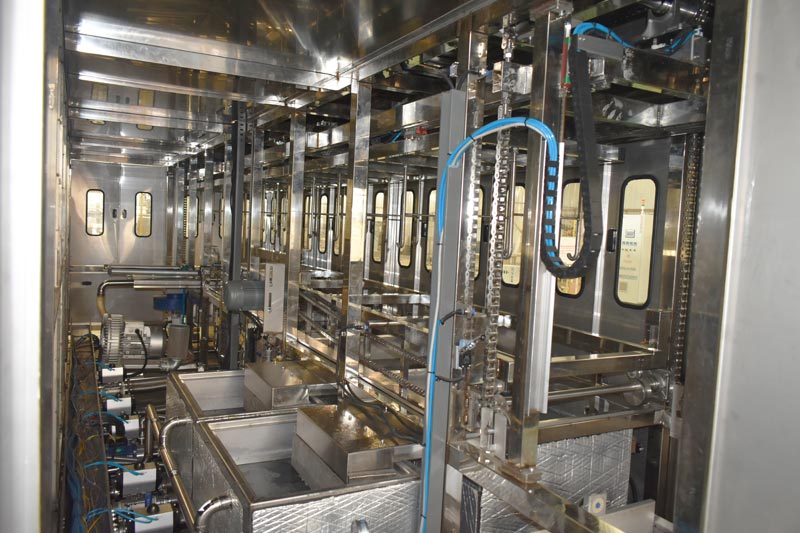 該設(shè)備針對清洗管件類工件,設(shè)備配有自動上下料工位、超聲波清洗系統(tǒng),自動拋動、自動溢流和油污分離裝置,噴淋系統(tǒng)、自動高壓切水系統(tǒng)、自動烘干系統(tǒng)。機械手自動輸送系統(tǒng)采用高精度直線導(dǎo)軌配合高精度位置檢測傳感器,機械手可以準(zhǔn)確的實現(xiàn)工件的抓取和放置。自動進排液和自動加溫系統(tǒng)完全實現(xiàn)了無人干預(yù),自動運行,很大程度上降低了工人的勞動強度。先進的霧氣處理系統(tǒng)可以將清洗時產(chǎn)生的霧氣冷凝回流,空氣經(jīng)過濾和活性炭吸附后排出。