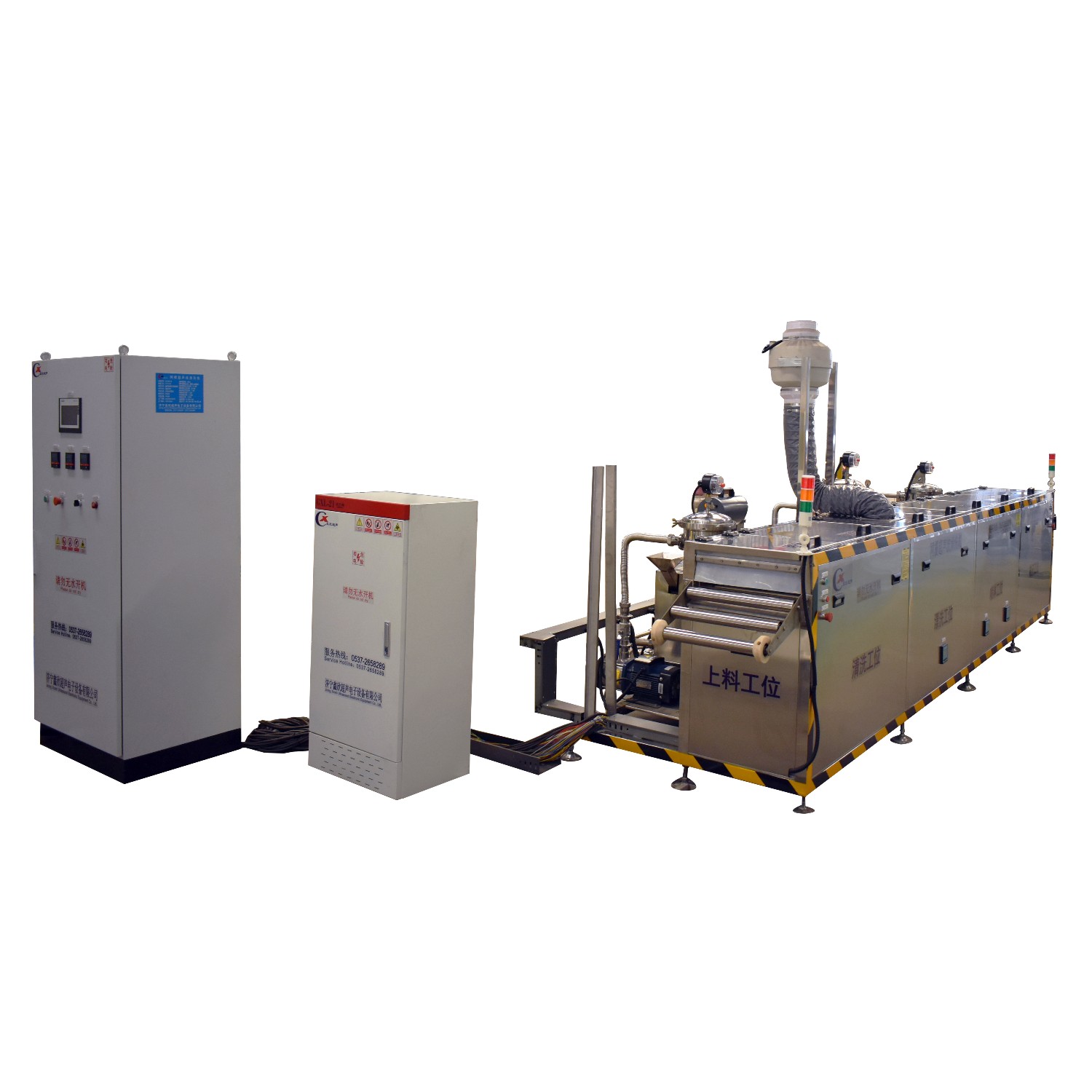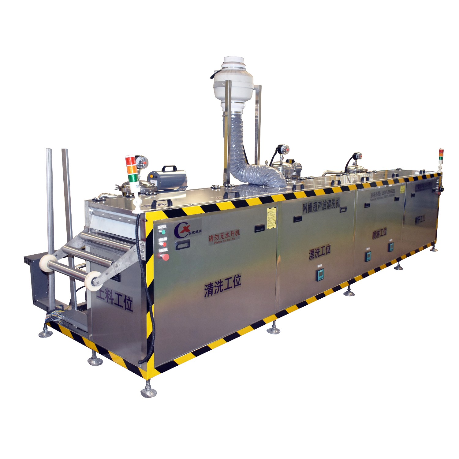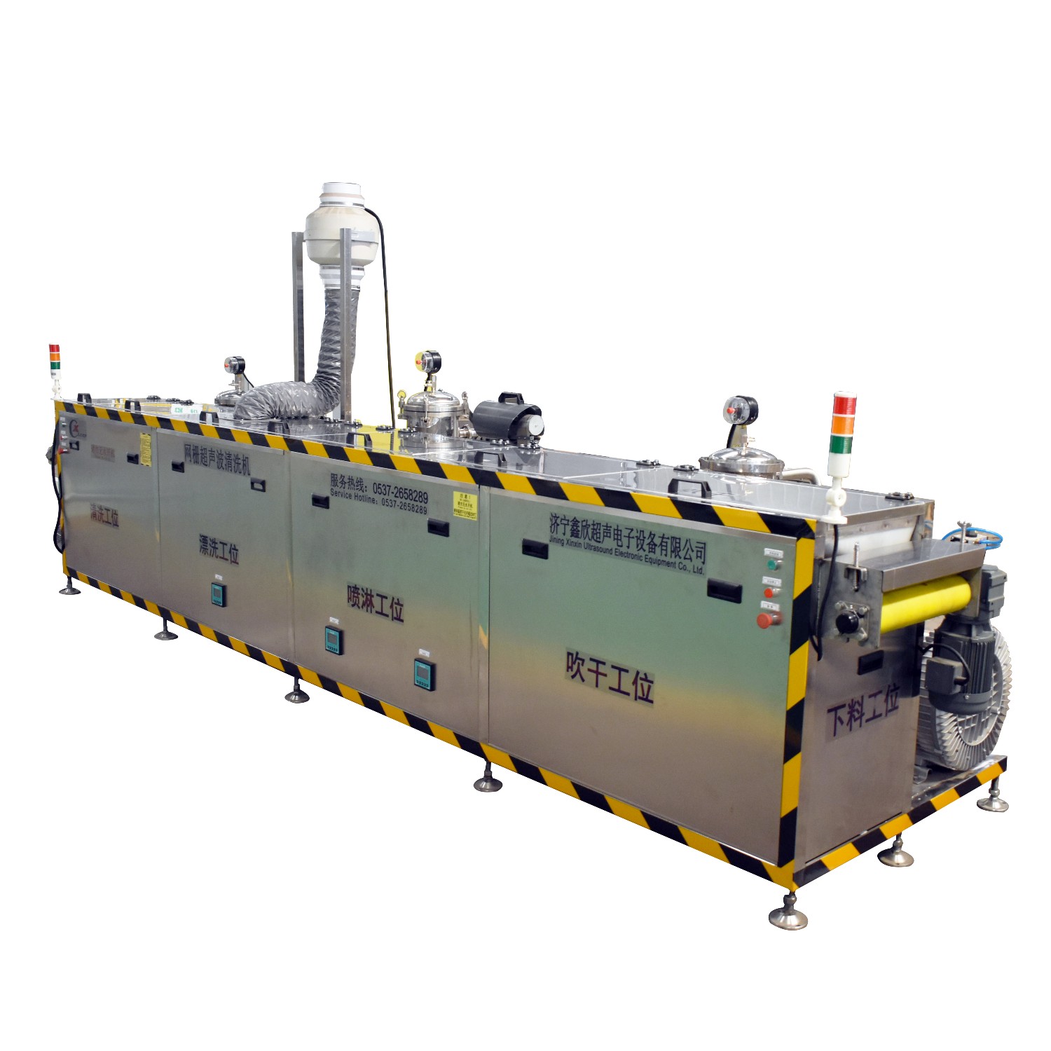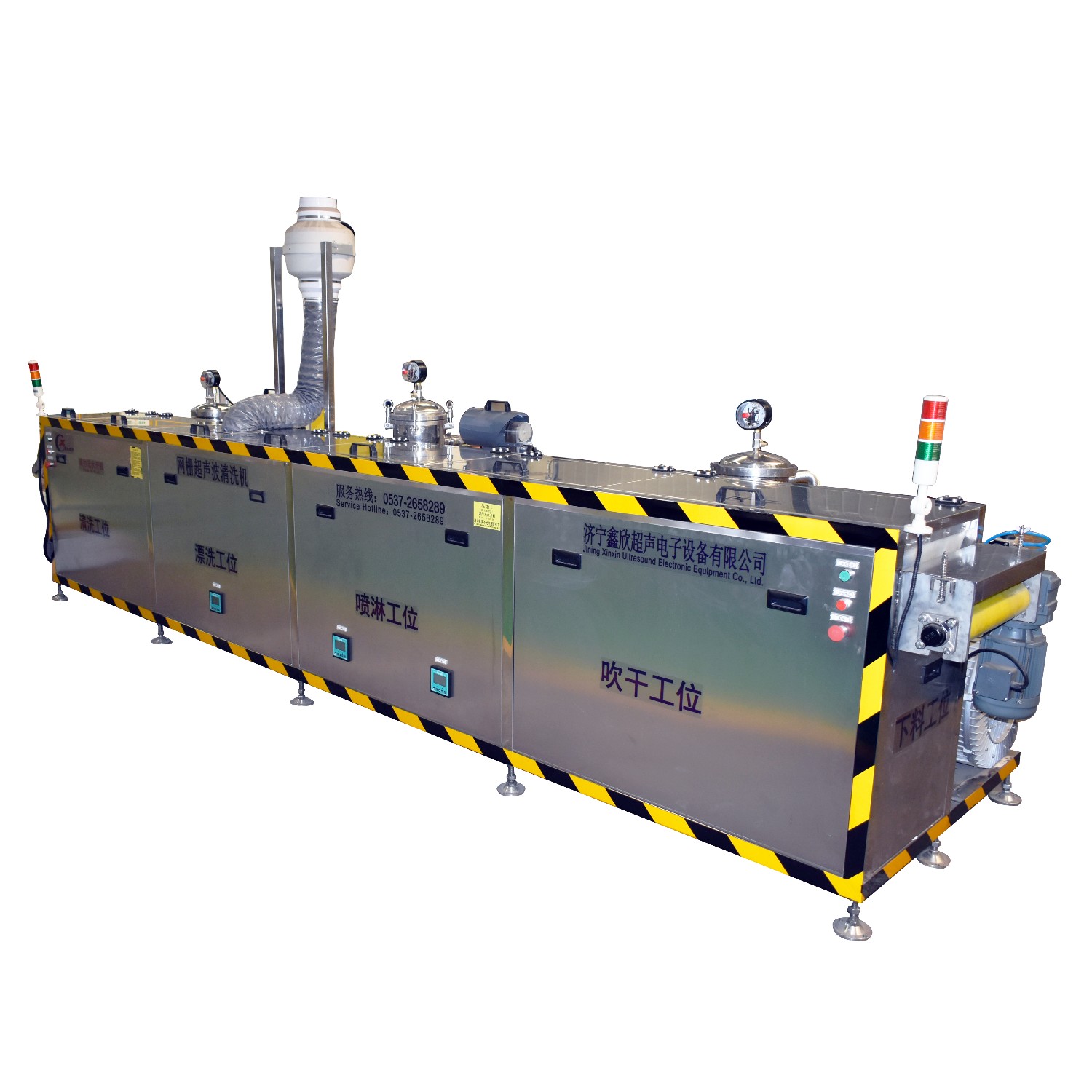 該設(shè)備為全自動(dòng)高潔凈度清洗機(jī),采用2%氫氧化鈉溶液以及純水清洗、超聲波清洗、噴淋清洗工藝。整機(jī)為半封閉式結(jié)構(gòu),主要?jiǎng)恿υ礊閯?dòng)力輸送裝置,PLC自動(dòng)控制。該設(shè)備共有六個(gè)工位:與上工序接料對(duì)接工位、超聲波清洗工位、噴淋漂洗工位1、噴淋漂洗工位2、高壓風(fēng)切工位、動(dòng)力滾筒對(duì)接收料工位。該設(shè)備清洗效果好,提高了此類工件的潔凈度。該機(jī)構(gòu)設(shè)計(jì)及工藝安排合理、自動(dòng)化程度高、清洗精度高,有效的解決了此類工件的清洗難題。